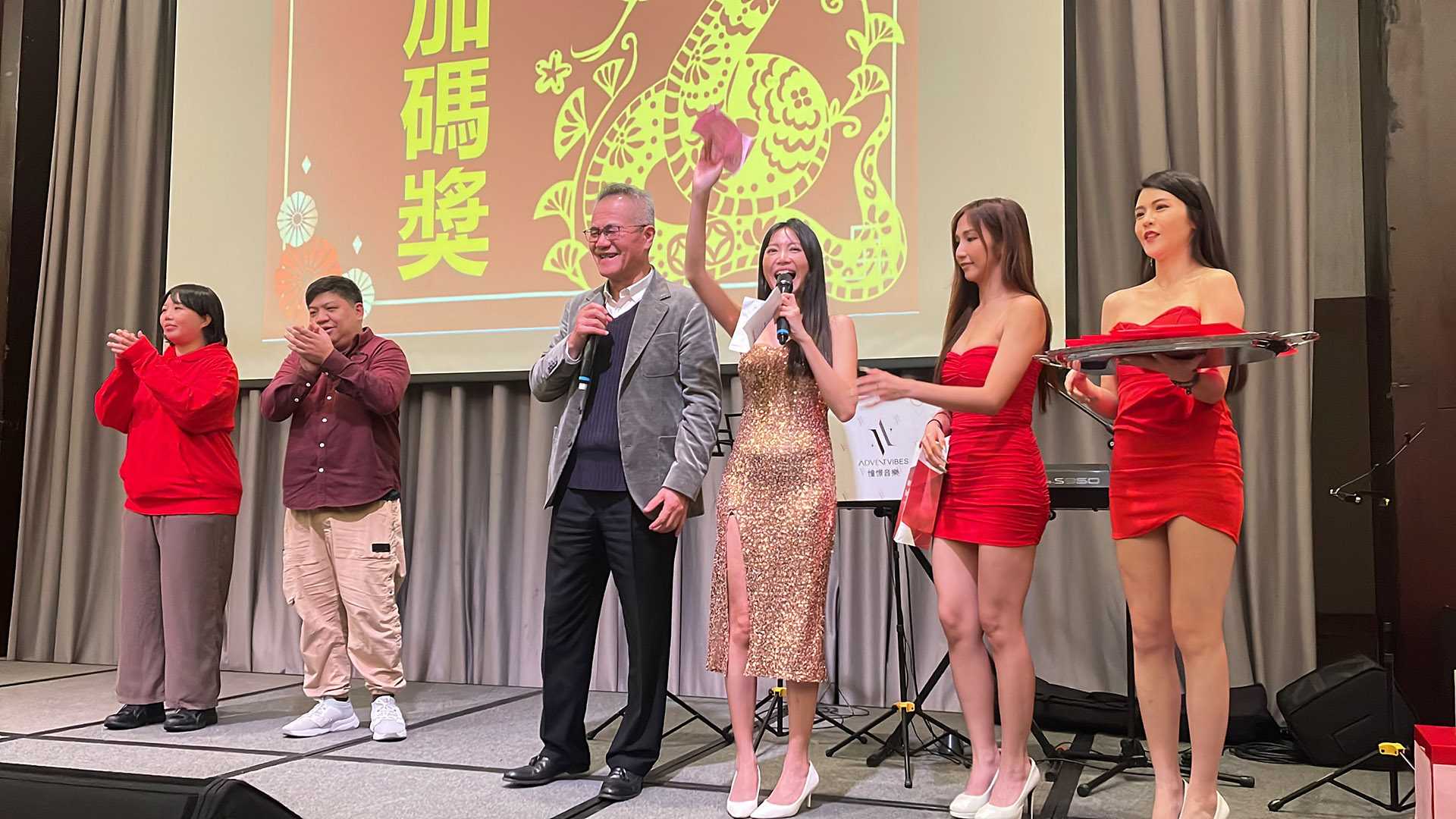 隨著主持人邀請董事長與副總上台,全場的焦點匯聚於舞台。舉杯敬酒的瞬間,不僅是感謝,更是對未來共同願景的承諾。這份一年比一年更具默契的合作,如同穎崴不斷超越自我,在科技領域持續領航,而憧憬音樂也很榮幸能連續三年,為這份榮耀增添璀璨光芒。
